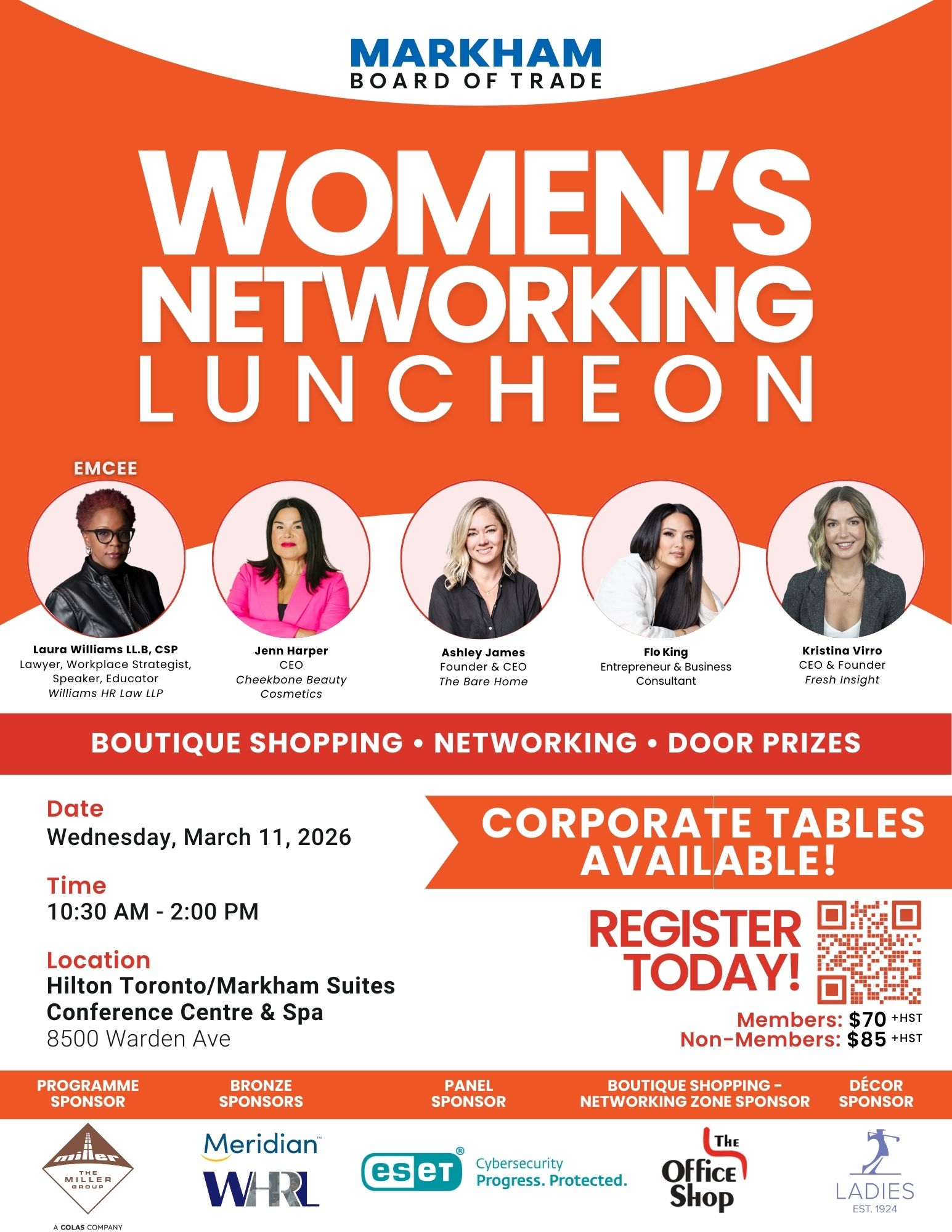 The Markham Board of Trade is proud to host our Women’s Networking Luncheon, 2x per year, Spring & Fall